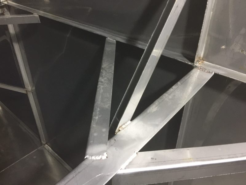 斜拉主要的作用在于分擔(dān)主拉筋的拉力,進(jìn)一步對水箱板進(jìn)行穩(wěn)固,切成500mm的長度,連接在水箱與主拉之間。形成龍爪式,常規(guī)尺寸為4cm*1cm厚度一般以靠近頂部的側(cè)板厚度為基準(zhǔn),連接處必須進(jìn)行滿焊處理。